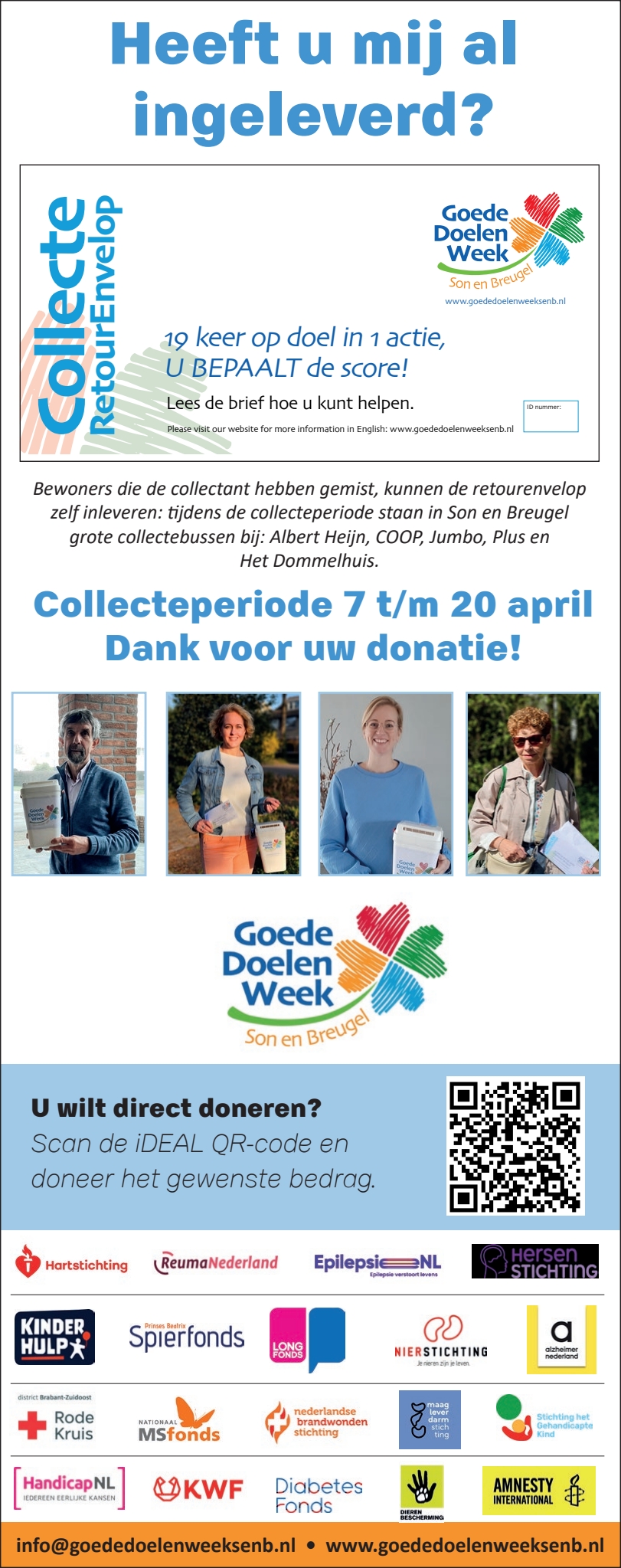 Deze week komen de collectanten de retourenveloppen met uw donatie bij u ophalen. Bewoners die de collectant hebben gemist, kunnen de retourenvelop zelf inleveren: tijdens de collecteperiode staan in Son en Breugel grote collectebussen bij: Albert Heijn, COOP, Jumbo, Plus en Het Dommelhuis.